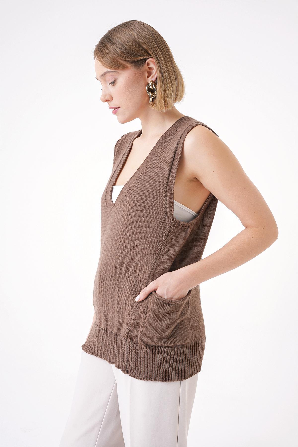 Chuba Kadın V Yaka Rahat Kalıp Çift Cep Asimetrik Dikiş Detaylı Triko Süveter Kahverengi 24W118