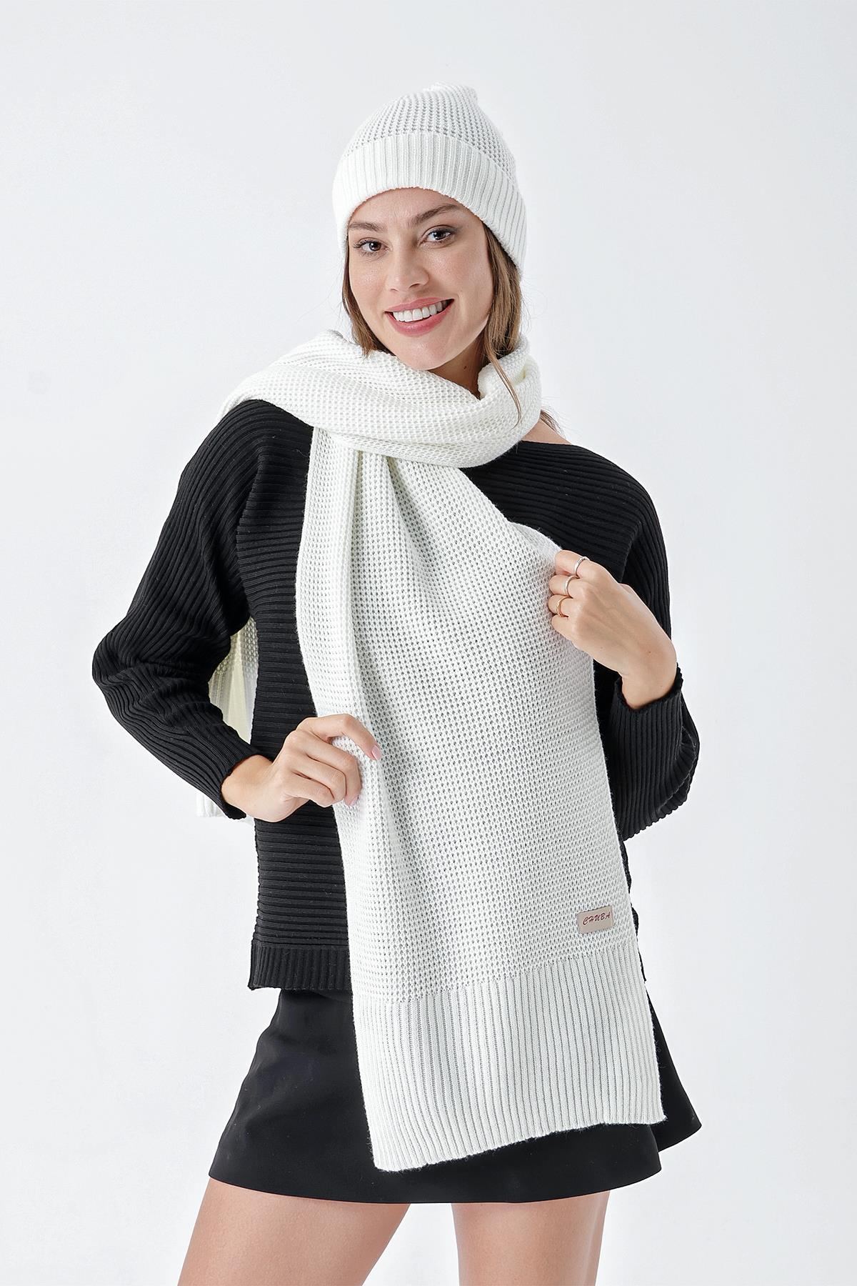 Chuba Kadın Yumuşak Tuşeli Örgü Detaylı Atkı Bere Takımı Ekru 24W132