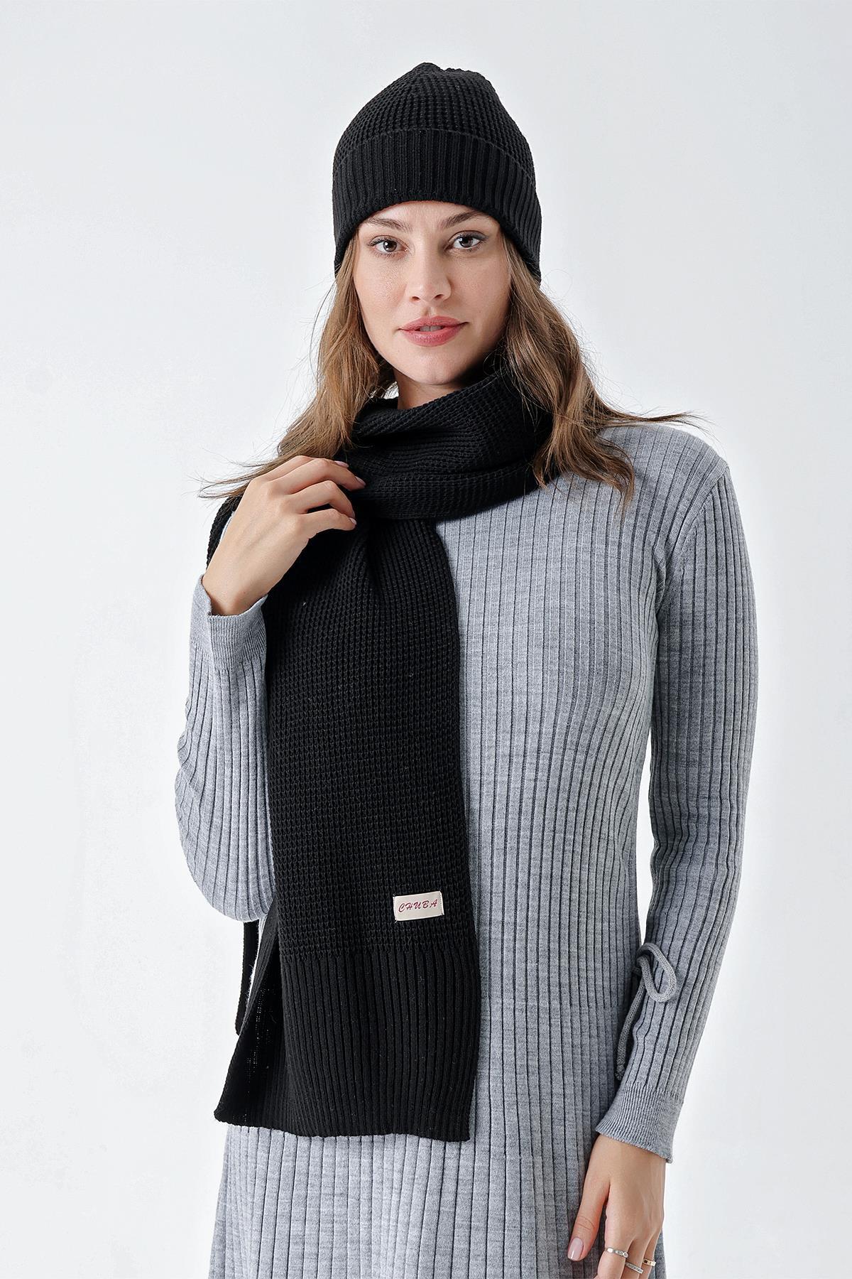 Chuba Kadın Yumuşak Tuşeli Örgü Detaylı Atkı Bere Takımı Siyah 24W132