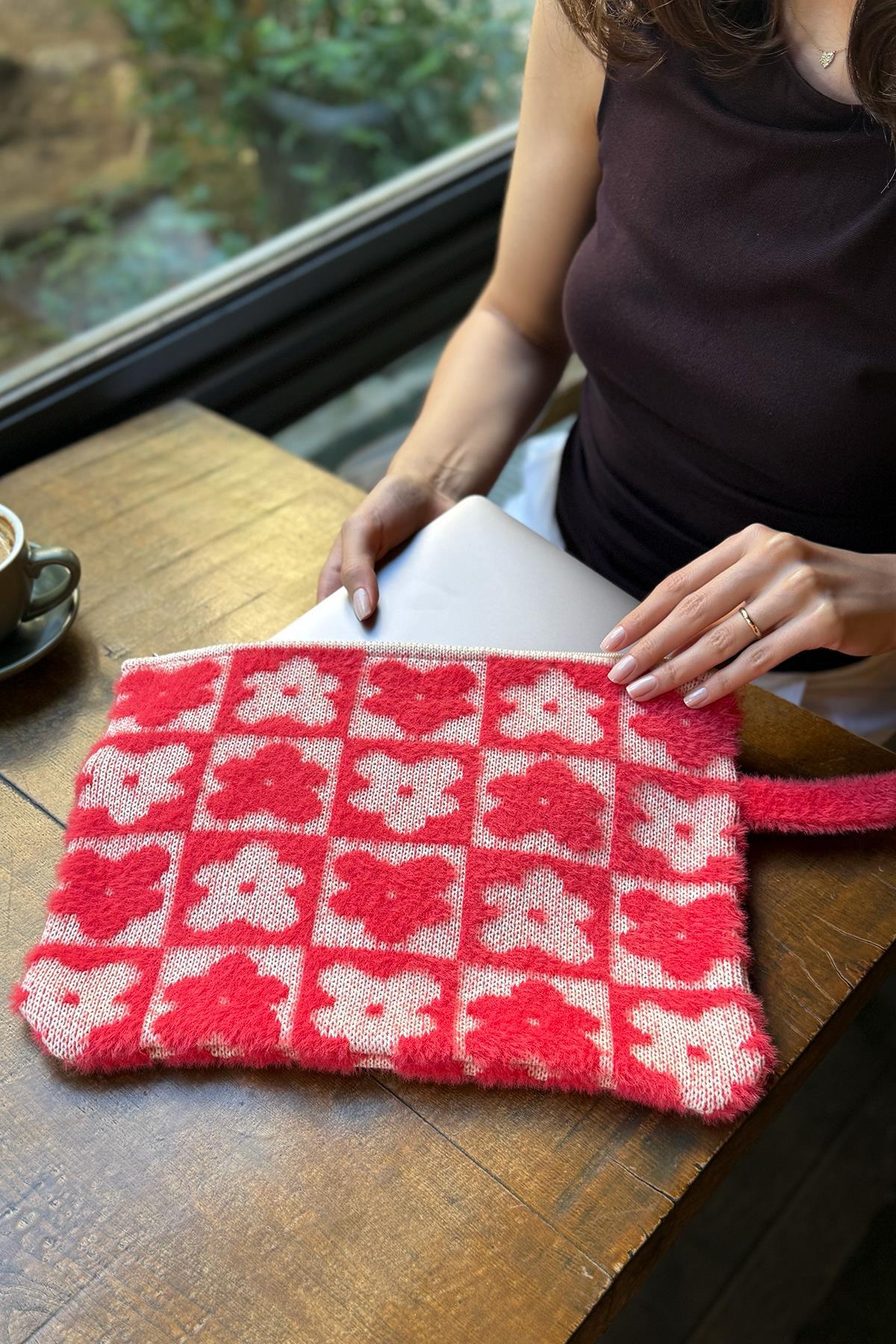 Chuba Yumuşak Tüylü Çiçek Desenli Triko Laptop & Macbook & Tablet Kılıfı 13”-14” Inç Uyumlu Nar-Beyaz CHAX826